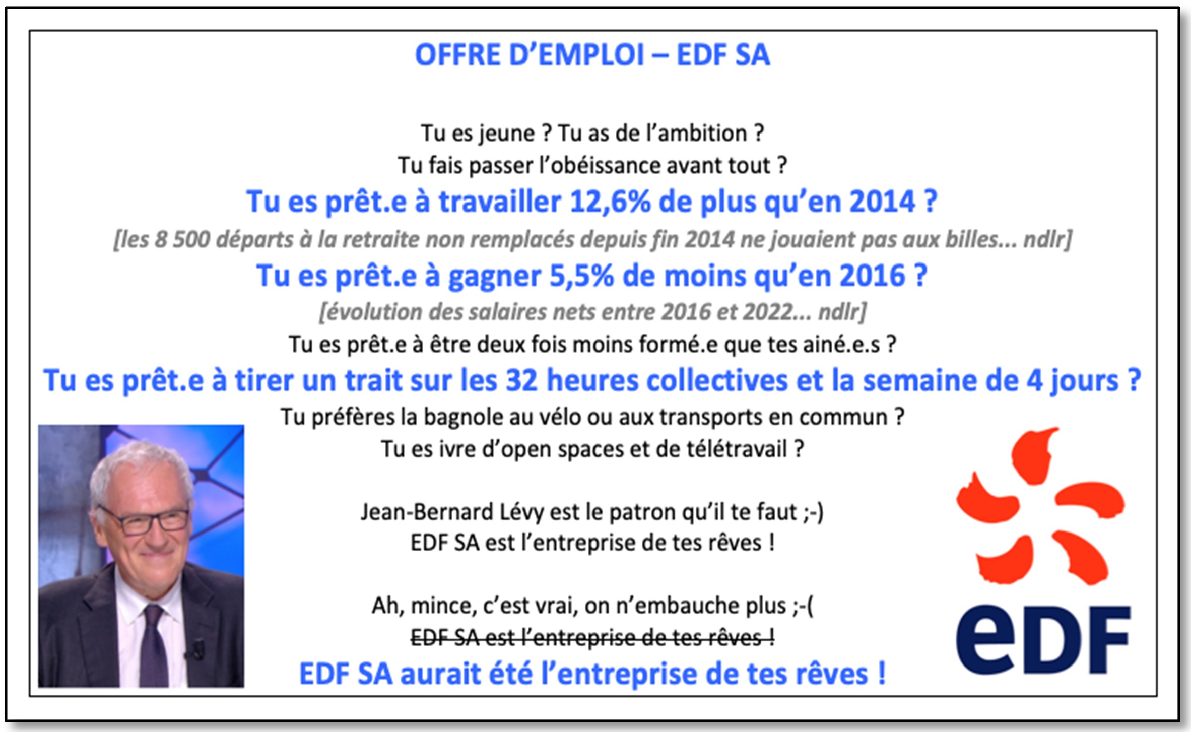En règle générale, ce type d’étude se mène sur le temps long, notamment pour SUD qui manque de données. C’est la troisième que mène l’équipe de SUD-ÉNERGIE EDF-DTG en un peu plus de huit années. Cette fois-ci, c’est en lisant dans Médiapart, le 10 janvier, l’appel à la grève de la CGT d’EDF pour le 25 janvier, pour un meilleur partage des richesses, que nous avons souhaité mettre nos données de 2018 à jour. Le moment n’est pas idéal (le bilan social 2021 d’EDF n’est pas encore sorti, les trajectoires d’austérité à venir non plus), mais en attendant notre étude finalisée (qu’on livrera au printemps), et même si notre fédération n’a pas été consultée pour les différents rendez-vous, voici les premiers éléments de notre contribution sur les rémunérations, les effectifs et le temps de travail au mouvement social qui se construit pour la fin du mois de janvier 2022. Pour faire simple, on pourrait résumer socialement le mandat de Jean-Bernard Lévy par cette petite annonce satirique, construite comme une offre d’emploi résumant son plan d’austérité sans fin :